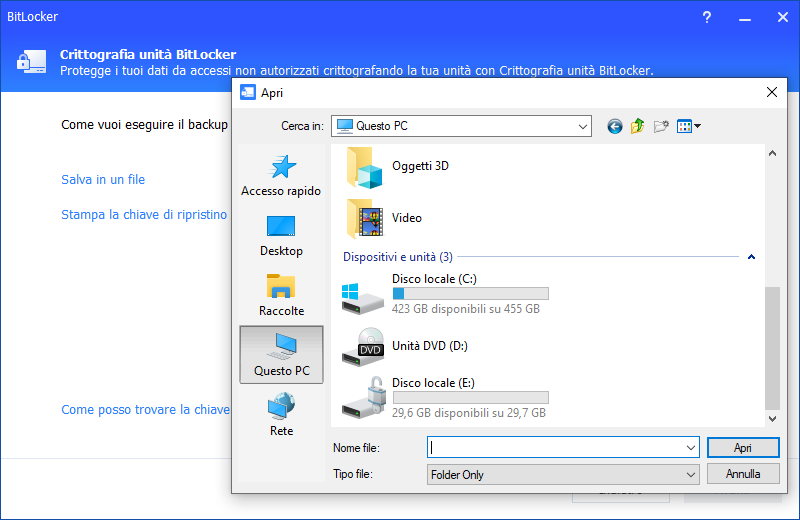 Passo 5. Se selezioni "Salva in un file", specifica una posizione sul tuo PC per archiviare il file TXT, che verrà nominato con "Bitlocker Recovery Key + 45-bit Key" e fai clic su "Avanti" per generarlo.
