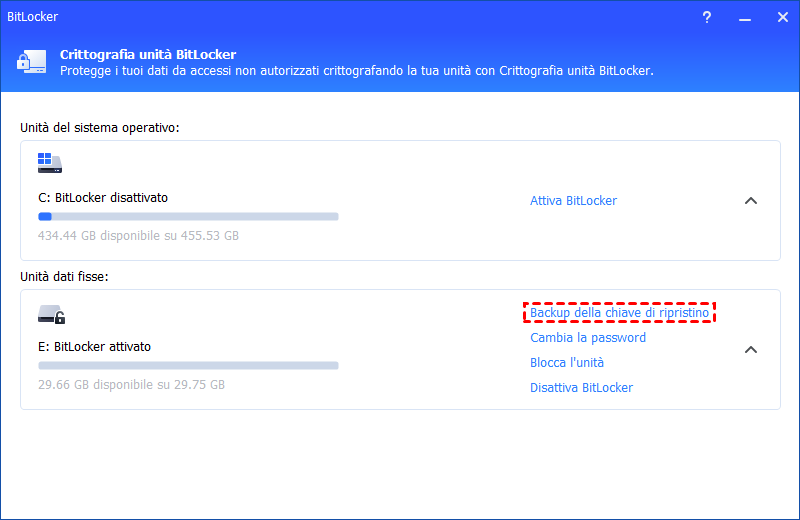Passo 2. Accedi all'unità crittografata e seleziona "backup chiave di ripristino".