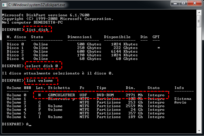 1. Verificare la lettera di unità del tuo CD/DVD di installazione di Windows 7 eseguendo i comandi: "diskpart-> list disk-> select disk 0 -> list volume".