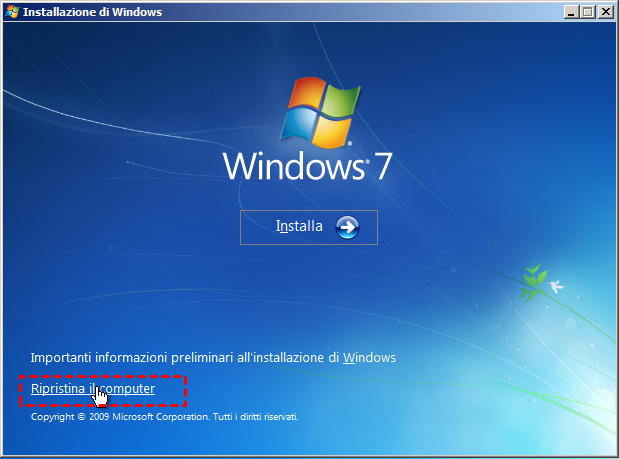 1. Avviare dal DVD o CD di installazione di Windows. Nella schermata di benvenuto, fare clic su "Ripristina il computer".