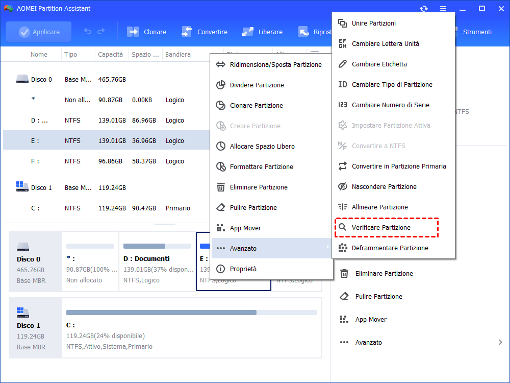 ☛ Passo 1. Installare ed eseguire lo strumento di riparazione ell'SSD sul tuo PC. Fare clic con il tasto destro del mouse sull'SSD danneggiato e selezionare "Avanzato"> "Verificare Partizione".
