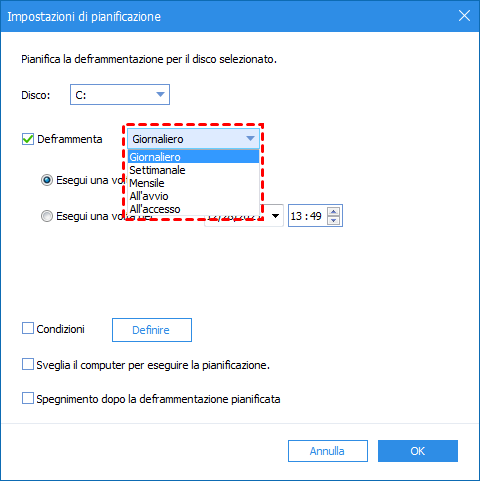 Passo 3. Ora, puoi scegliere quale unità deframmentare e decidere se eseguire una deframmentazione quotidiana, settimanale o mensile. Poi, si può considerare la preimpostazione su quali condizioni deframmentare.