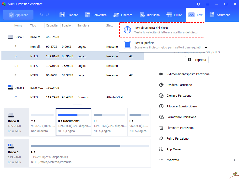 Passo 2. Nell'interfaccia principale, clicca su "Test" e seleziona "Test di velocità del disco".