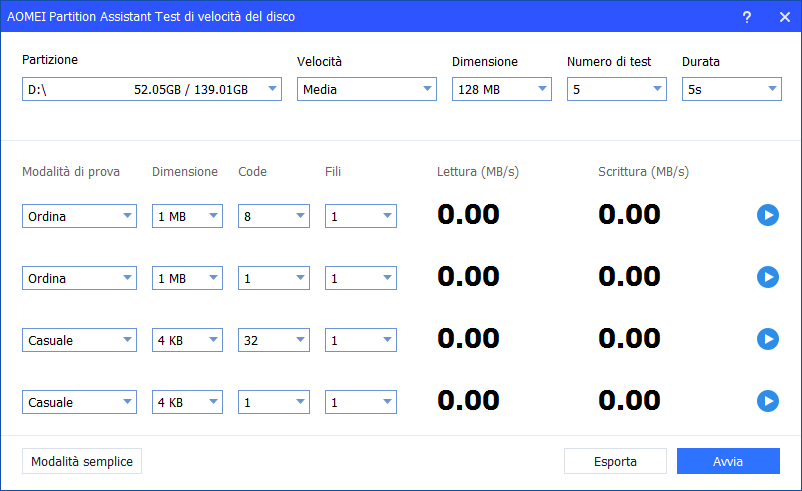 AOMEI Partition Assistant Professional è un potente software per testare la velocità del disco. Supporta due modalità di test: Modalità Semplice e Modalità Esperto. Fornisce risultati di test più accurati e dettagliati e permette agli utenti di esportare i risultati del test.