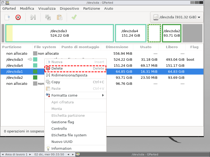 Passo 5. Quindi è necessario eliminare la seguente partizione "/dev/sda1". Fare clic con il pulsante destro del mouse e selezionare "Delete". Prima di ciò, puoi eseguire il backup della partizione per mantenere i dati al sicuro.