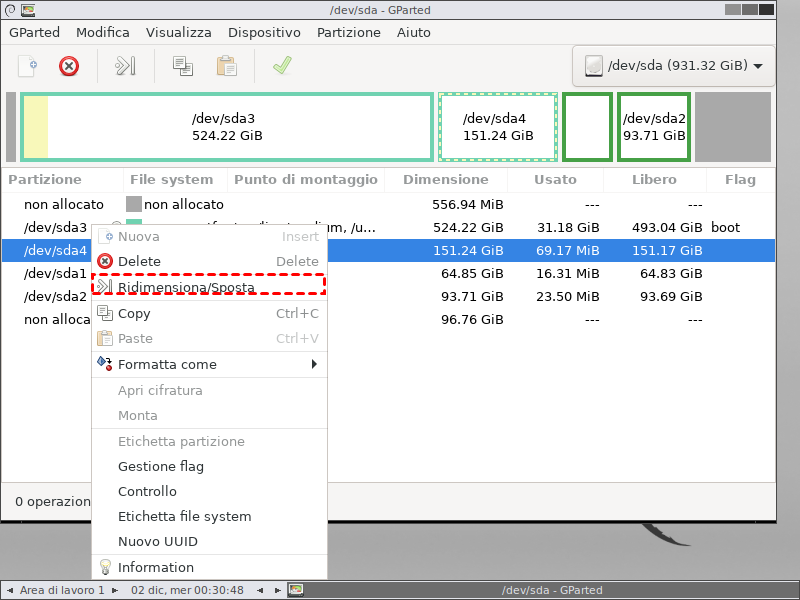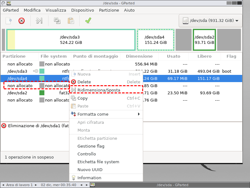 Passo 6. Dopo l'eliminazione, la partizione "/dev/sda1" si trasformerà in uno spazio non allocato. Ora puoi fare clic con il pulsante destro del mouse sulla partizione "/dev/sda4" e selezionare "Ridimensiona/Sposta".