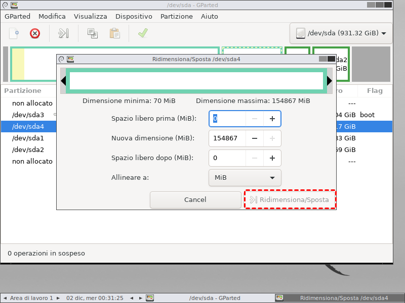 Passo 4. Qui prendiamo come dimostrazione l'unione delle partizioni "/dev/sda4" e "/dev/sda1". Quando fai clic con il pulsante destro del mouse sulla partizione "/dev/sda4" e selezioni "Ridimensiona/Sposta", troverai che non c'è alcuno spazio libero prima e dopo la partizione selezionata, quindi non puoi unire direttamente quelle due partizioni.