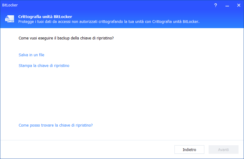 Suggerimenti: Non salvare la chiave di ripristino nel percorso dell'unità criptata. Ad esempio, non è possibile criptare D: e salvare la chiave di ripristino sulla stessa unità D:.
