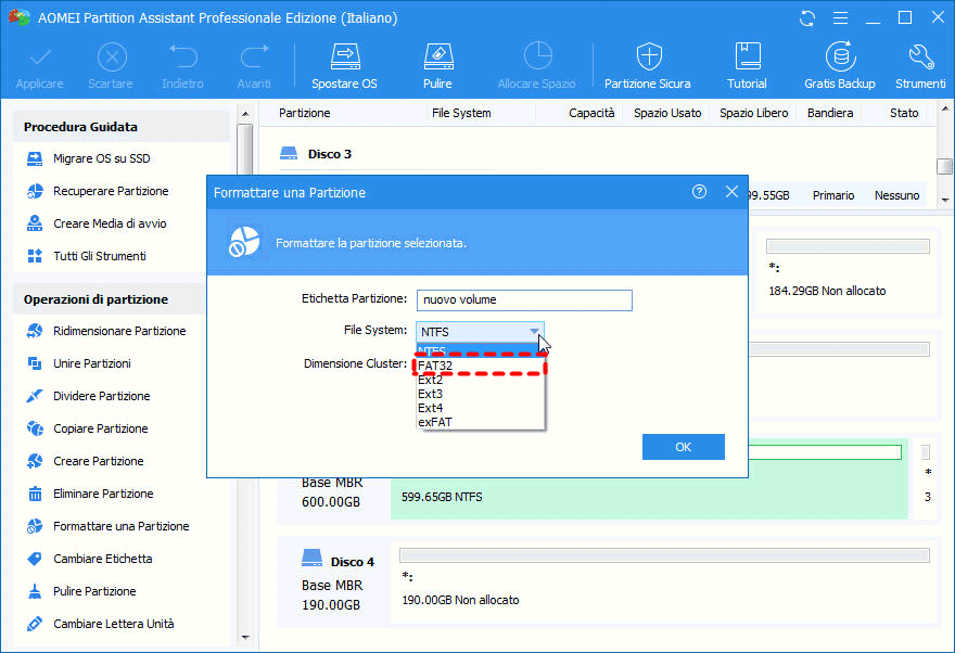 3. Selezionare FAT32 come il disco rigido esterno File System, poi fare clic OK.