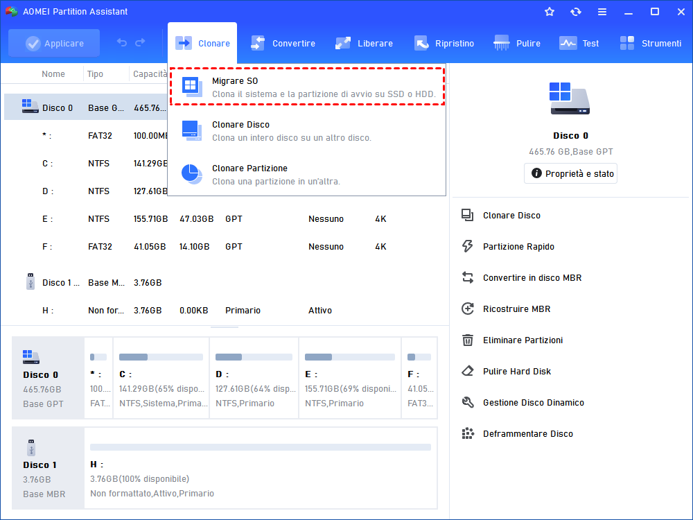 Per trasferire la partizione di avvio o l'unità su SSD in modo semplice e veloce, consigliamo vivamente di utilizzare AOMEI Partition Assistant Professional. La sua funzione integrata Migrare OS su SSD è in grado di spostare il sistema operativo su un nuovo HDD/SSD senza reinstallarlo e il disco rigido spostato non avrà alcun problema di avvio. Non dovete preoccuparvi di eventuali difficoltà operative, perché il suo funzionamento è molto semplice e può essere completato con pochi clic del mouse, anche se siete dei principianti inesperti.