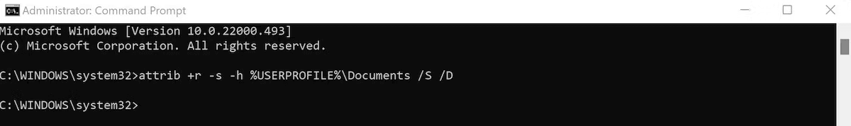 2. Digita "attrib +r -s -h %USERPROFILE%\Documents /S /D" e premi Invio per eseguire il comando.