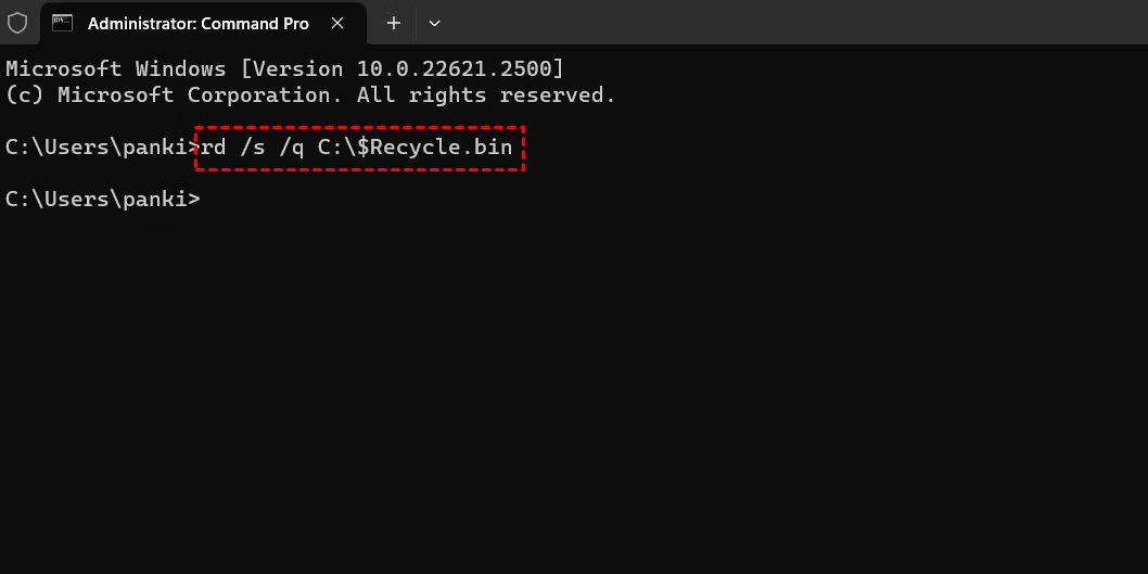 2. Poi, digita “rd / s /q C:\$Recycle.bin” e premi il tasto Invio per eseguirlo. Nota che dovrai sostituire C con la lettera dell'unità che contiene il Cestino danneggiato.