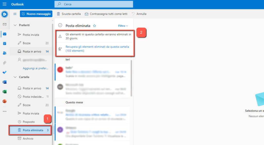 🔸 Passo 2: Nel pannello laterale sinistro, clicca su “Posta eliminata” per vedere le email recentemente cancellate.