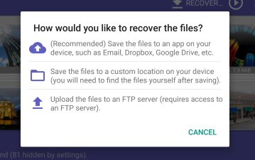 - Salva in un'app: Invia i file recuperabili a un'altra app sul tuo dispositivo. È il modo di salvataggio più consigliato.