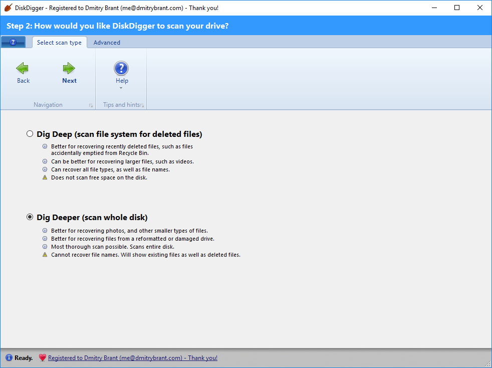 Passaggio 3: Durante la scansione, DiskDigger ti consentirà di scegliere tra le modalità Affonda in profondità e Affonda ancora di più. Si consiglia di scegliere la modalità Affonda ancora di più per il recupero foto.