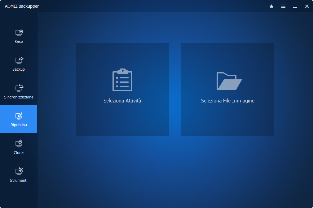 Passo 1. Avvia AOMEI Backupper, (anche da disco di avvio, se necessario). Vai su "Ripristina" e seleziona "Attività" o "File Immagine". In questo caso scegliamo "Attività".