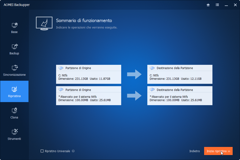Passo 4. Verifica il riepilogo delle operazioni e, se tutto è corretto, clicca su "Inizia ripristino" per procedere.