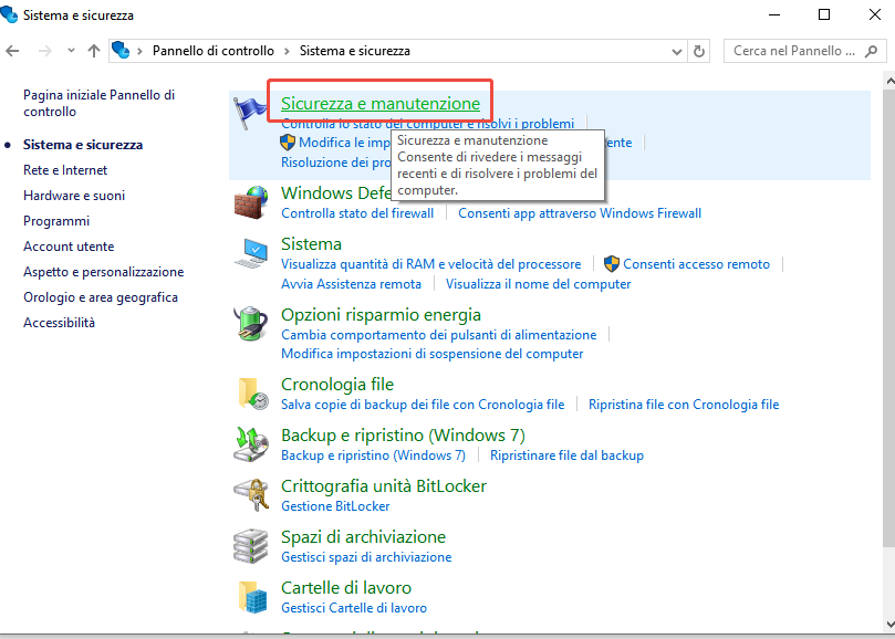 Passo 2. Vai su "Sistema e sicurezza"→"Centro operativo"→ espande"Manutenzione" → clicca"Esegui scansione".
