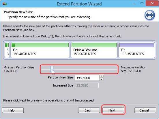Passo 2. Sposta il mouse a sinistra/destra per aumentare/diminuire la dimensione della partizione di sistema C e quindi fai clic su OK per continuare l'operazione.