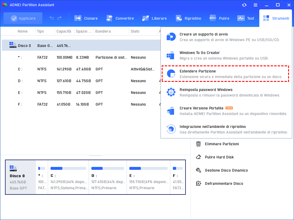 AOMEI Partition Assistant fornisce anche una funzione chiamata “Estendere Partizione” per aiutarti ad aumentare la dimensione della partizione C. I passaggi specifici sono i seguenti: