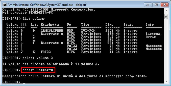Se vuoi rimuovere la lettera di unità, digita “remove letter=R”.