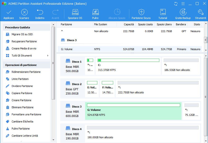 AOMEI Partition Assistant è un gestore di partizioni di terze parti. AOMEI Partition Assistant ti fornisce un altro modo per assegnare la lettera di unità molto più facile. Le persone possono assegnare la lettera di unità o rimuovere la lettera di unità senza il comando Diskpart o la riga di comando di Partition Assistant. Inoltre, può assegnare lettere di unità su qualsiasi file system. Inoltre, ha funzioni più complete e permette di gestire i dischi in modo flessibile.