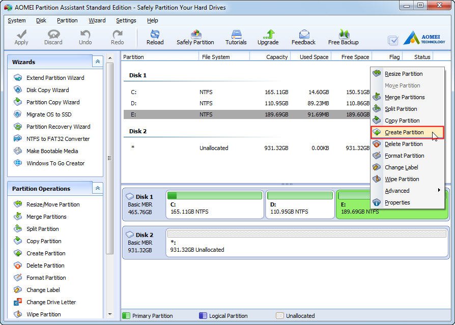AOMEI Partition Assistant fornisce un'interfaccia utente grafica (GUI) per partizionare i hard disk. È possibile utilizzare t creare partizioni su una partizione esistente o uno spazio non allocato. Con l'interfaccia intuitiva, creare partizioni per il computer dovrebbe essere molto facile che anche un noob possa operare da solo.