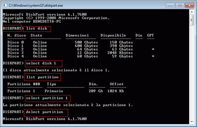 Se si utilizza un disco dinamico, eliminare la partizione è possibile eliminare tutti i volumi dinamici sul disco. Per eliminare un disco dinamico, puoi utilizzare il comando "delete volume".