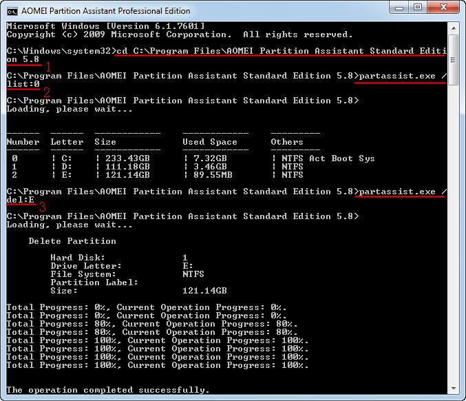 Per superare le limitazioni di Diskpart, puoi utilizzare alcuni programmi di terzo partito per eliminare partizione da riga di comando. AOMEI Partition Assistant è un grande strumento di gestione delle partizioni potente e fornisce la riga di comando per gestire i dischi e fornisce agli utenti di Windows PC il disco in maniera gratuita. Per eliminare la partizione da riga di comando utilizzando AOMEI, è possibile eseguire i seguenti comandi.