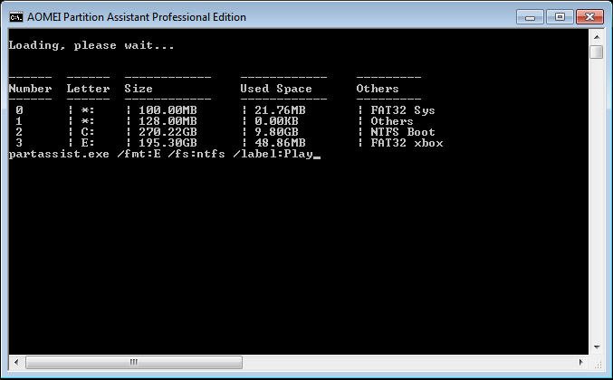 5). Digita partassist.exe /fmt:E /fs:ntfs /label:Play per formattare FAT32 in NTFS. Premi Enter.