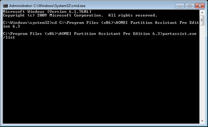 1). Digita cd C:\Program Files\AOMEI Partition Assistant Pro Edition 6.5, premiEnter. Il percorso è elenco di installazione di AOMEI Partition Assistant. E poi digita partassist.exe /list, premi Enter.