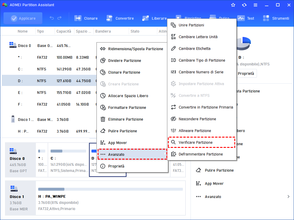 Passo 2. Fai clic con il pulsante destro del mouse sulla partizione che desideri controllare. Scegli "Avanzato" e poi clic su "Verificare Partizione".