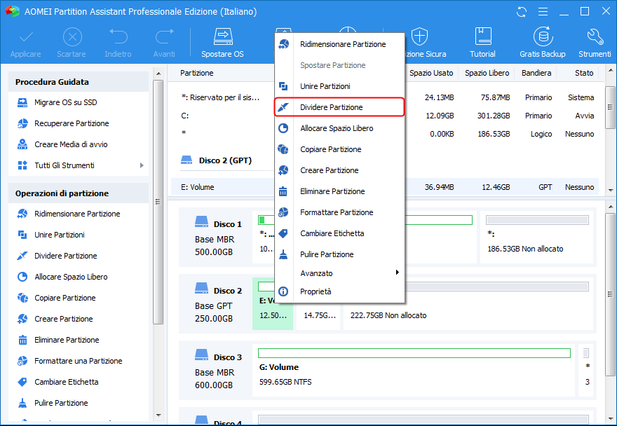One-key Suddivisione: Selezionare una partizione nella console principale di AOMEI Partition Assistant, premere il tasto enter e quindi dividerà la partizione.
