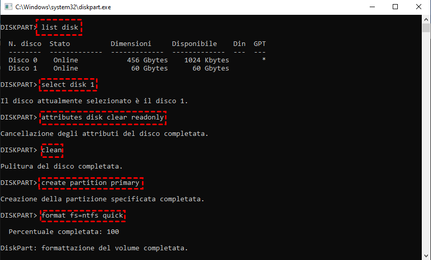 Fino ad ora, l'attribuzione della protezione da scrittura è stata rimossa dal disco. Successivamente è necessario inserire alcuni altri comandi come di seguito per formattare il disco.