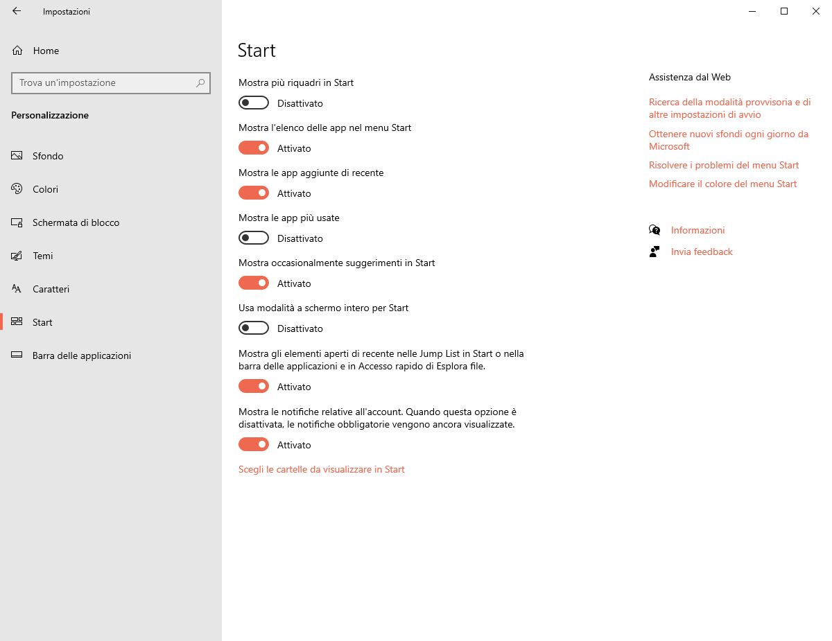 Passaggio 2. Clicca su Start nel riquadro a sinistra e passa l’opzione da attivata a disattivata, ovvero “Mostra gli elementi aperti di recente nelle Jump List in Start o sulla barra delle applicazioni”.