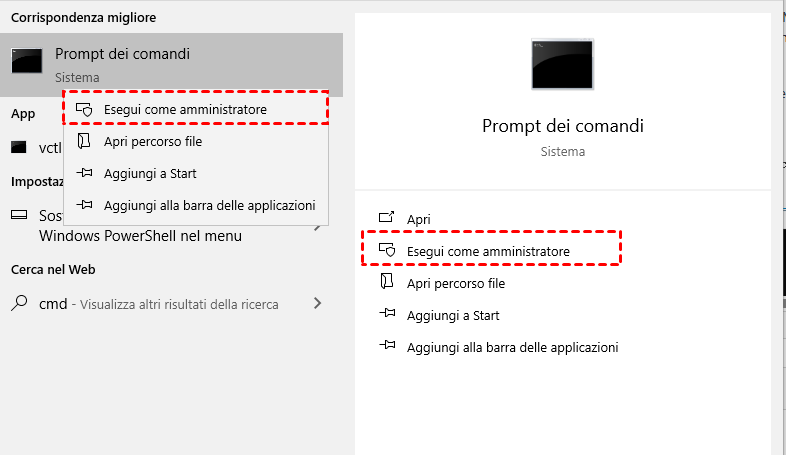 Passaggio 1. Premi il tasto Windows e digita “cmd” nella barra delle applicazioni, poi clicca su “Esegui come amministratore”.