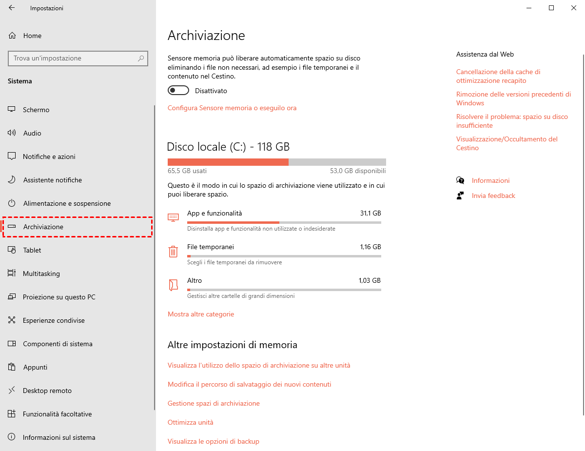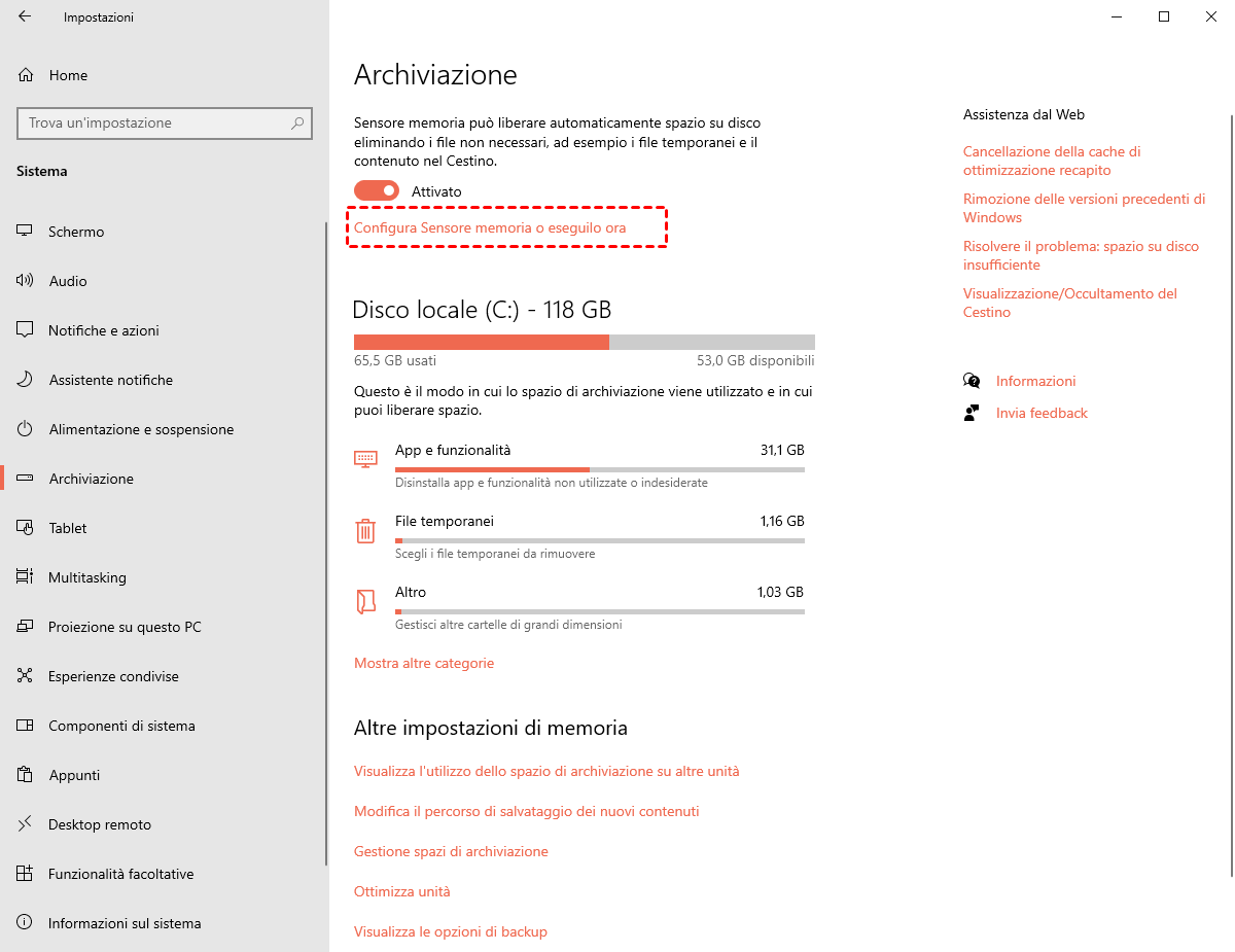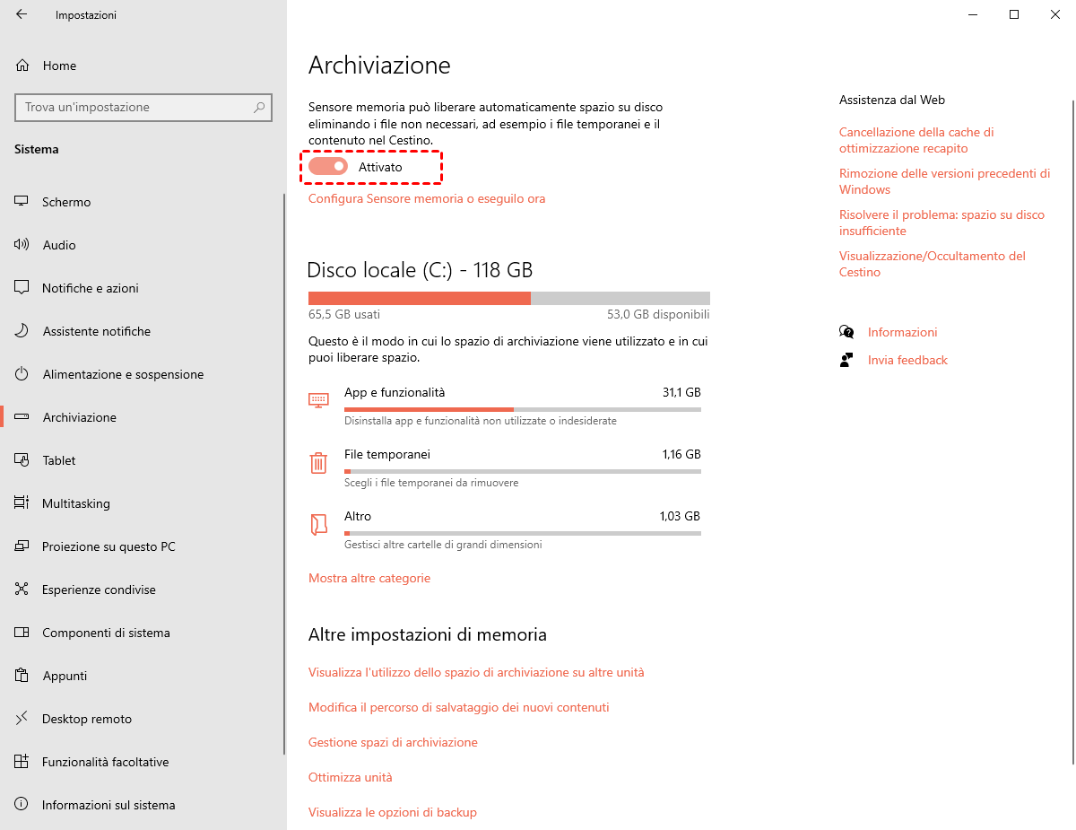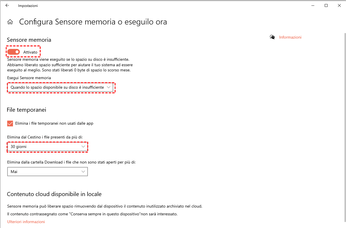Un altro metodo automatico: attivare Sensore memoria per cancellare file temporanei Windows 10