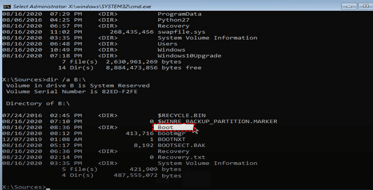 Passo 3. Dopo aver trovato la cartella di avvio nella partizione di sistema o nella partizione riservata di sistema, è necessario eseguire "X: \Sources>dir /a b: \Boot" per richiamare lo strumento bcdedit e puntarlo all'archivio dati di configurazione di avvio che hai trovato.