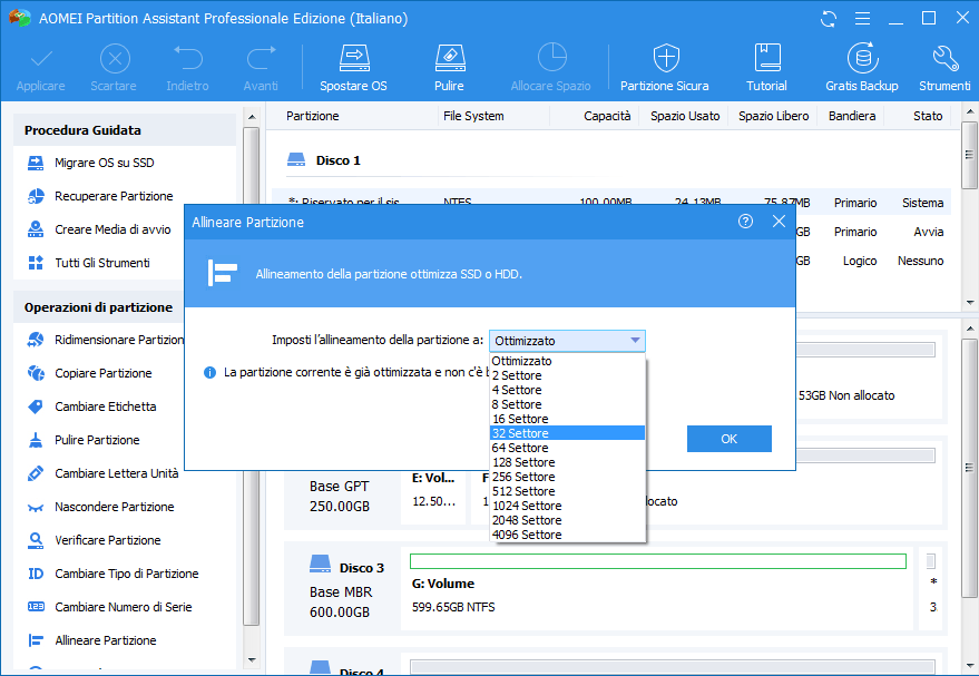 Se la partizione è già allineata correttamente, AOMEI Partition Assistant ti darà informazioni per avvertirti che "La partizione corrente è stata allineata al settore selezionato e non è necessario allinearla di nuovo".