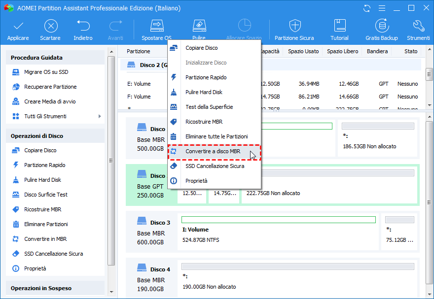 Per convertire il disco GPT con il sistema operativo installato in MBR per una migliore compatibilità, la maggior parte degli utenti potrebbe voler finire la conversione senza perdere dati. Allora AOMEI Partition Assistant Professional è un ottimo strumento, che può convertire GPT in MBR (o MBR in GPT) senza danneggiare i dati interni, compreso il sistema operativo. Questo è un vantaggio maggiore rispetto alla conversione da GPT a MBR tramite il Prompt dei comandi, che richiede di eliminare tutte le partizioni all'interno.