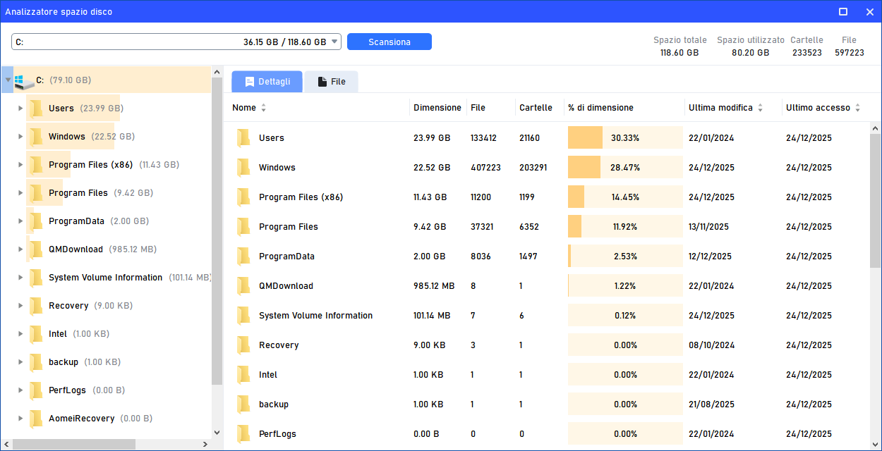 Con l’aiuto dello strumento Analizzatore spazio disco, puoi analizzare facilmente lo spazio delle unità del computer e individuare rapidamente i file che occupano più spazio, per poi eliminarli.