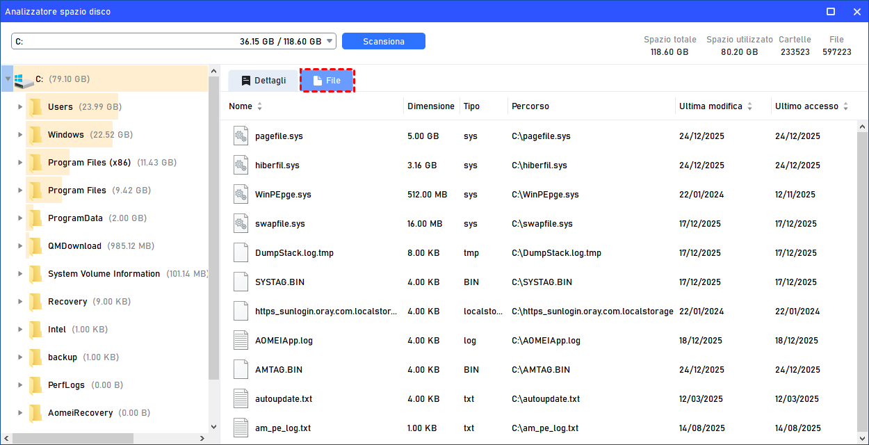 “Analizzatore spazio disco” in AOMEI Partition Assistant è un nuovo strumento per analizzare e liberare lo spazio su disco del computer. Grazie a questa funzione, puoi individuare facilmente ed eliminare i file che occupano più spazio, liberando così spazio su disco.
