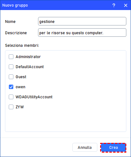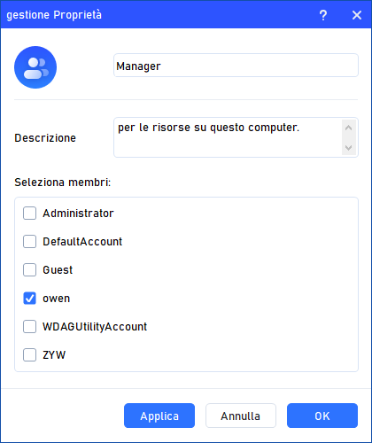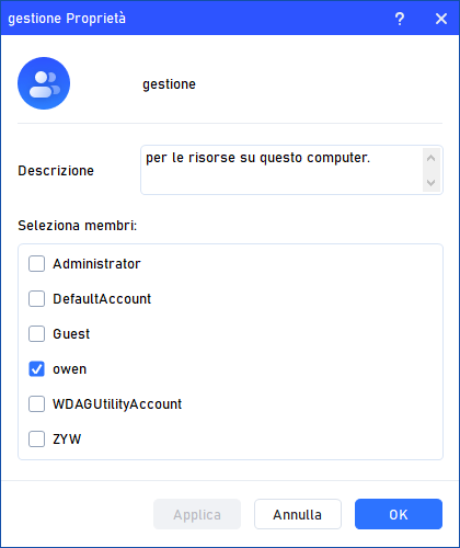 Clicca sull’opzione “Aggiungi al gruppo” per modificare la descrizione del gruppo e aggiungere o rimuovere account utente. Clicca su “Applica” o “OK” per confermare le modifiche.