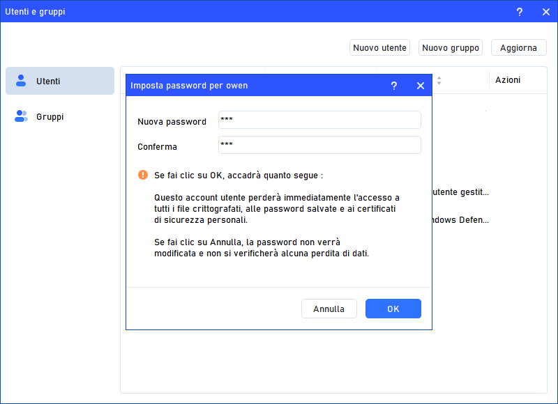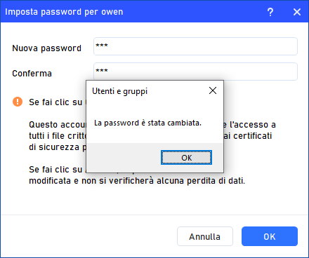 Suggerimento: Se clicchi su “OK”, questo account perderà l’accesso a tutti i file criptati, alle password salvate e ai certificati di sicurezza personali.
