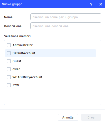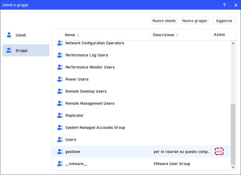 Alcuni gruppi predefiniti, come Amministratore, Utenti, Ospiti, ecc., non possono essere eliminati.