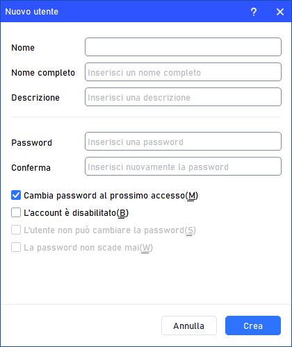 Puoi inoltre selezionare o deselezionare le caselle: L’utente deve cambiare la password al prossimo accesso, Account disabilitato, L’utente non può cambiare la password, La password non scade mai.