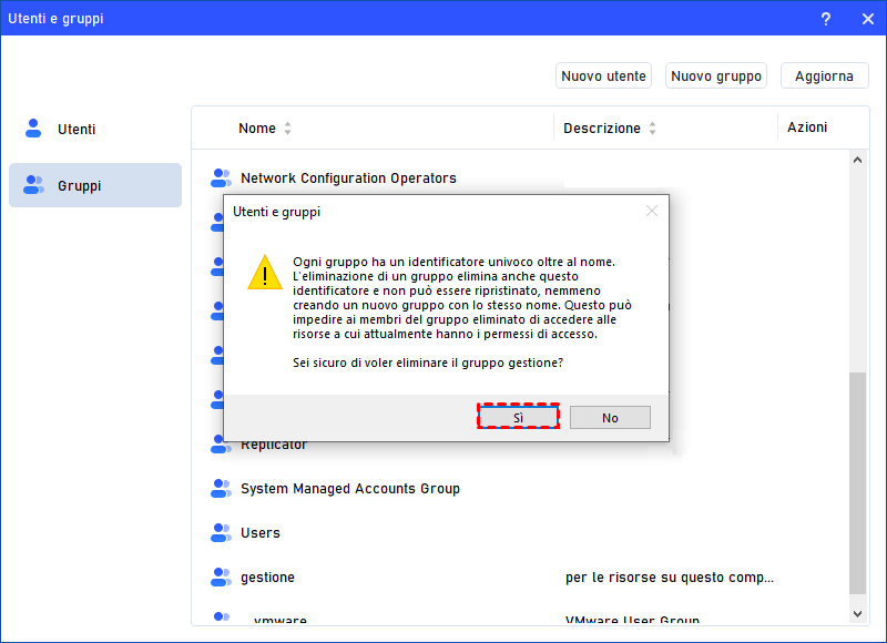 Comparirà una finestra pop-up che ti avvisa che l’eliminazione cancellerà anche l’identificativo del gruppo. Clicca su “Sì” per confermare e il gruppo verrà eliminato immediatamente.