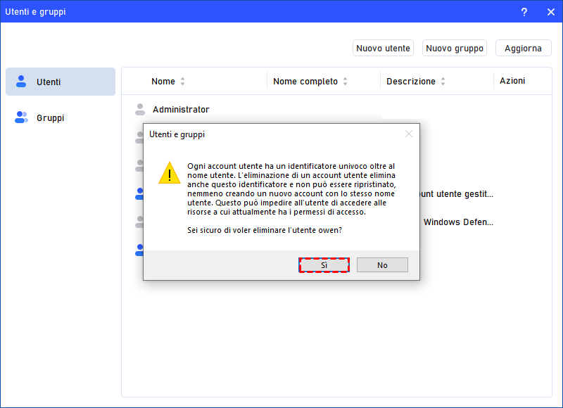 Comparirà una finestra pop-up che ti avvisa che l’eliminazione cancellerà anche l’identificativo dell’utente. Clicca su “Sì” per confermare e l’account verrà eliminato immediatamente.
