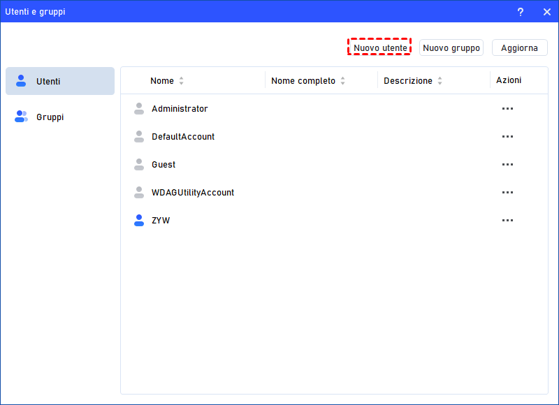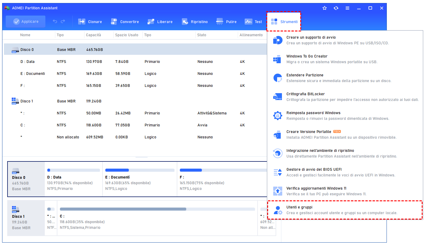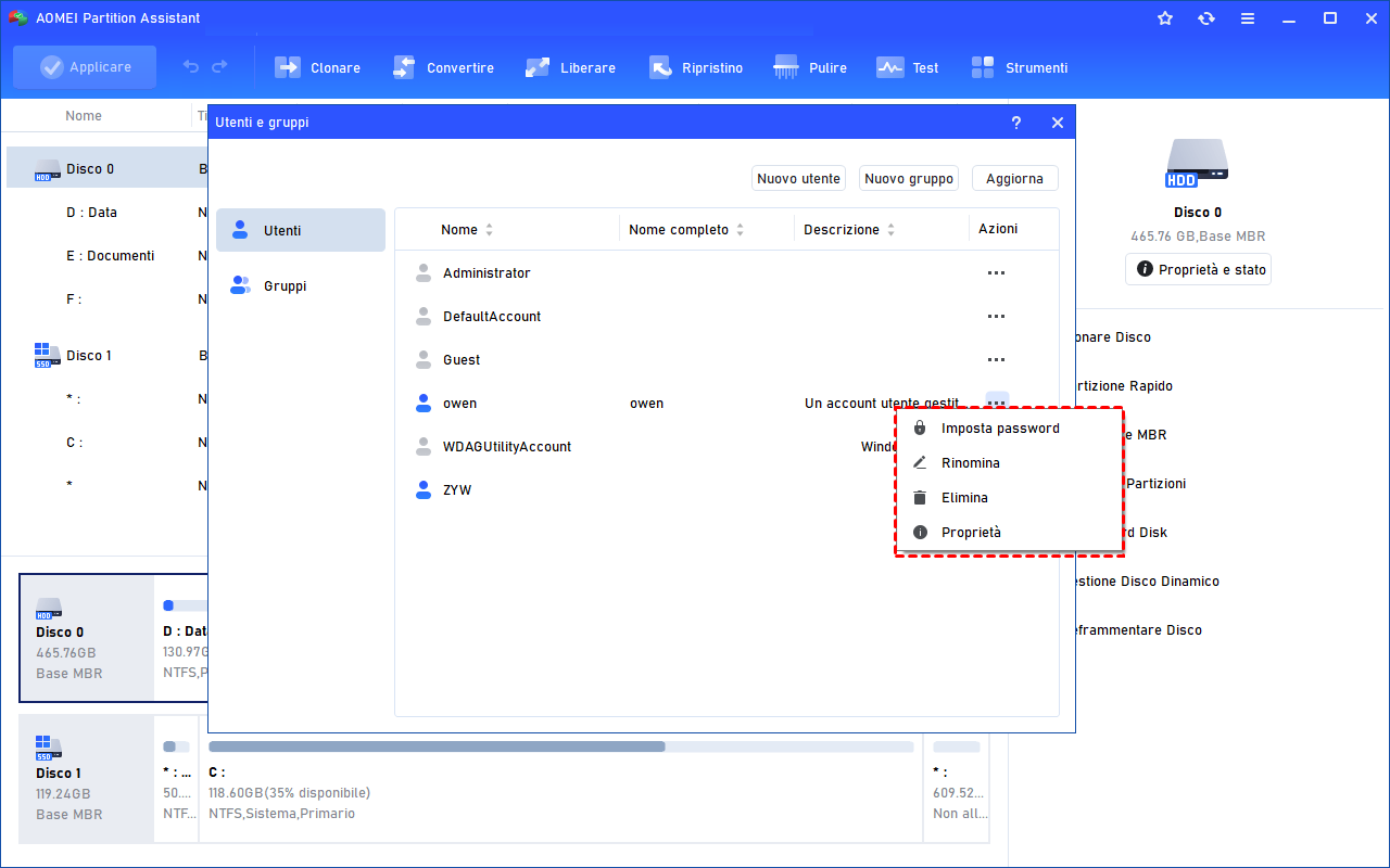 Con lo strumento “Utenti e Gruppi” di AOMEI Partition Assistant, puoi creare e gestire con facilità gli account utente locali e i gruppi su un computer locale.