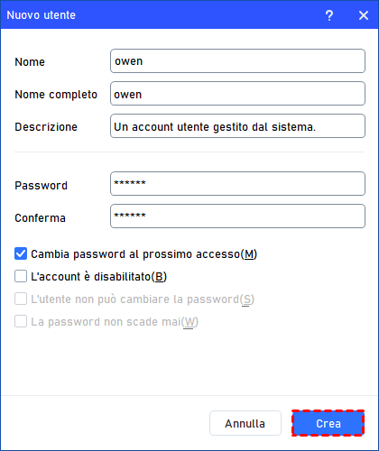 3. Dopo aver impostato tutto, clicca su “Crea” per creare il nuovo utente.